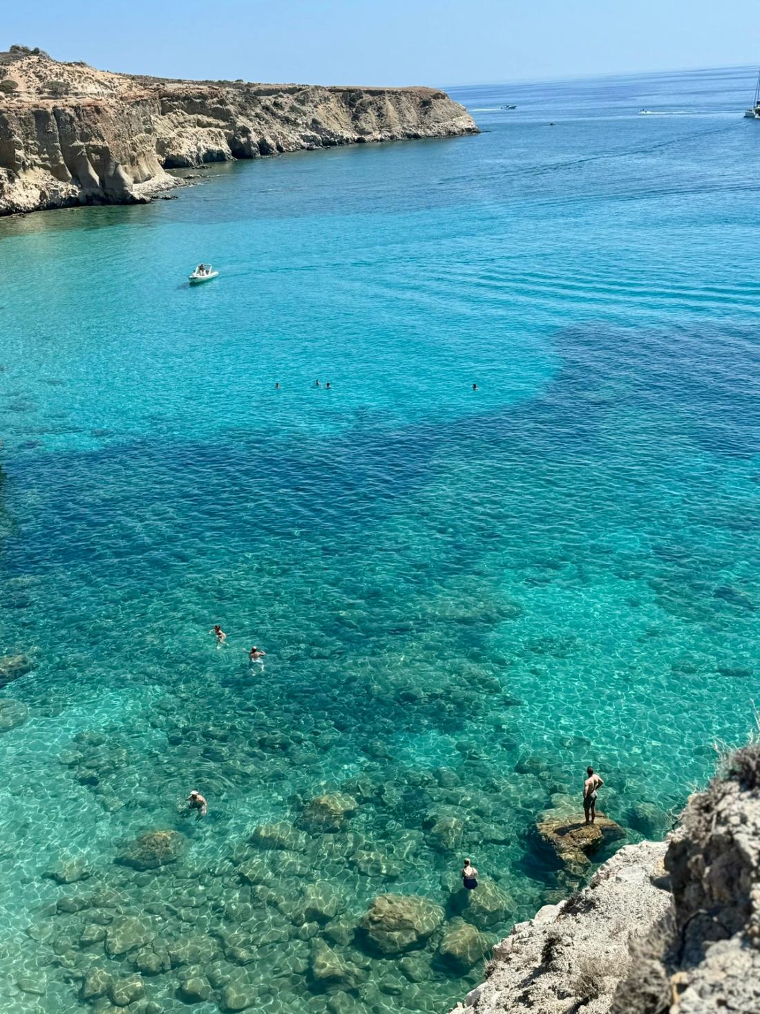 Exploring Milos by boat is essential, as many hidden treasures are best accessed by sea. Kleftiko, a breathtaking cove with turquoise waters and dramatic cliffs, and Polyaigos, an uninhabited island with an exceptionally bright blue cove. If travelling by yacht, Polyaigos is a fantastic place to dock.