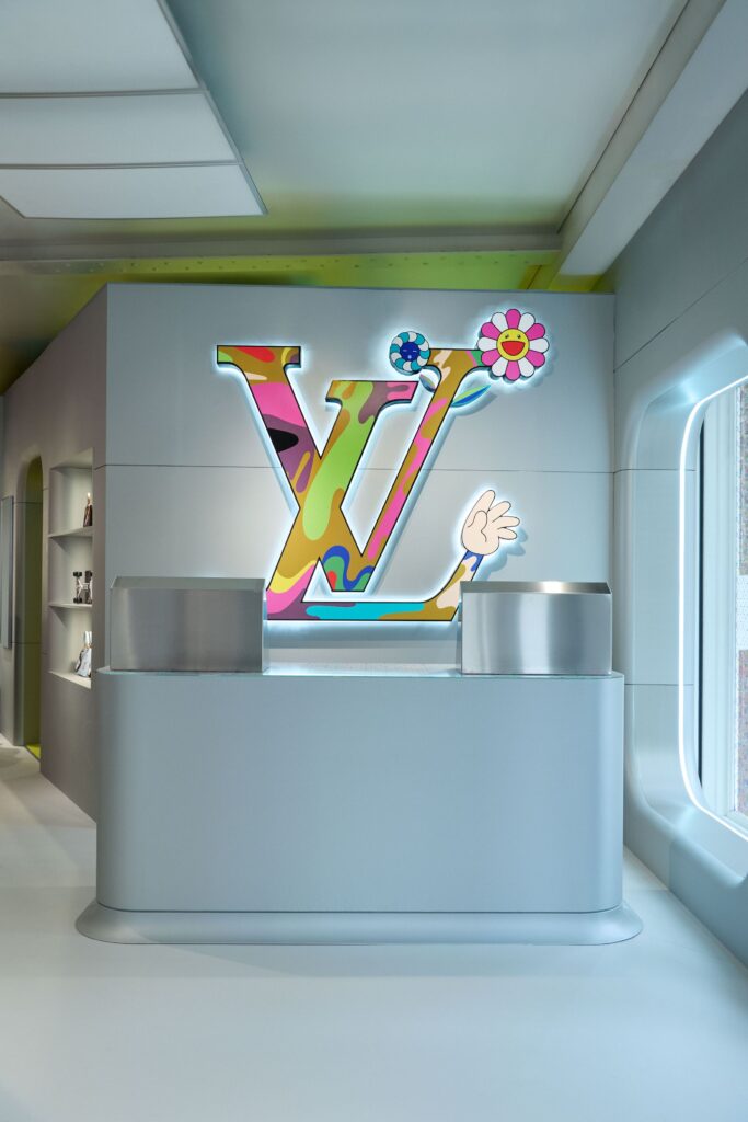 The pop-up’s engaging elements extend beyond the collection itself, offering visitors an array of immersive experiences. A flower-themed archival module showcases historic designs such as the 2003 Monogram Dalmatien and the 2010 Monogram Multicolore. There are vending machines dispensing collectible items, including exclusive stickers, trading cards, and a portable Murakami-themed game, to customers using Murakami-designed tokens. Guests can relax in the film lounge, reclining on Murakami’s signature flower cushions while enjoying digitally enhanced Superflat movies. Additionally, a care station provides bespoke repair services for original Louis Vuitton x Murakami pieces, ensuring timeless pieces are refreshed and preserved.